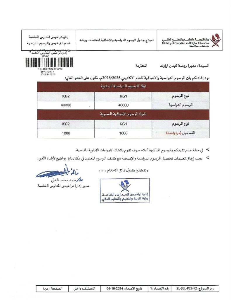 Registration Fee QR 1000 (This is a non-refundable once-off fee for every new child)